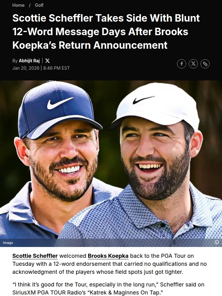 Gabriella Gonzalez+FollowScheffler Welcomes Koepka Back to PGA TourWorld No. 1 Scottie Scheffler didn’t mince words on SiriusXM PGA TOUR Radio, giving a blunt 12-word welcome to Brooks Koepka’s return. Instead of focusing on the controversy over tighter field spots, Scheffler kept it about competition: he’s pumped to battle Koepka again. With the Returning Member Program now in play, could we see more LIV stars like Rahm and DeChambeau back soon? #Sports #Golf #PGATour00Share