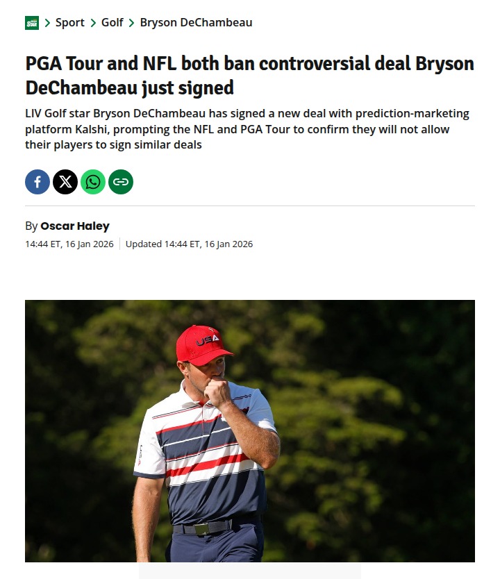 Tammy Davenport+FollowPGA Tour Draws Line on Bryson’s Kalshi DealThe PGA Tour just made a bold move, shutting down any shot of their players signing deals like the one Crusher Captain Bryson DeChambeau just inked with Kalshi. After Brooks Koepka’s return to the Tour, Bryson’s sticking with LIV and pushing the envelope on prediction markets. This call by the PGA and NFL to ban such partnerships is stirring up debate—are they protecting the game, or just slow to adapt? #Sports #Golf #PGATour10Share