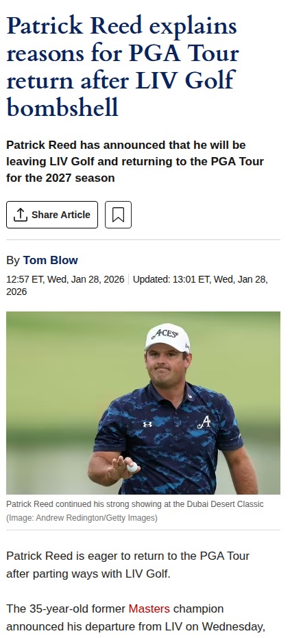 rmendoza+FollowPatrick Reed's PGA Tour Comeback!Captain America is heading back to where it all began! After his Hero Dubai Desert Classic win, Patrick Reed announced he’s leaving LIV Golf and returning to the PGA Tour for the 2027 season. Reed’s move follows Koepka’s, flipping the script on the LIV vs. PGA rivalry. Will this spark more defections? And how will the 4Aces GC fill Reed’s shoes? Let’s hear your takes on Reed’s legacy and what this means for both tours! #Sports #Golf #PatrickReed00Share