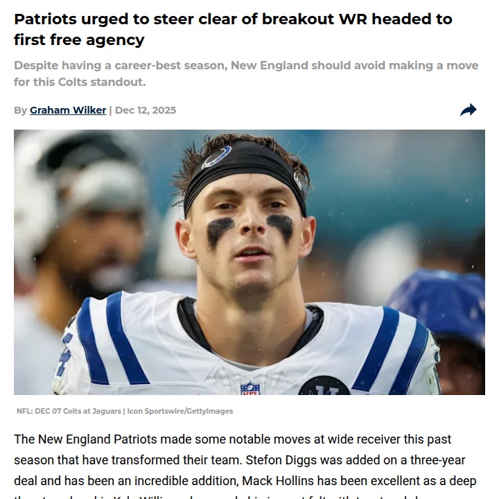 John Camacho+FollowPatriots WR Room: No Need for Alec Pierce?With the Pats’ WR corps already stacked—Stefon Diggs is cooking, Pop Douglas is thriving, and Mack Hollins is stretching the field—some fans are calling for another big-name addition. But should New England really shell out $20M/year for Alec Pierce, a deep threat with limited volume? Given how Boutte and Douglas are already top-20 in yards per catch, it feels like overkill. Wouldn’t that cash be better spent chasing a true game-changer like A.J. Brown if he hits the market? #Sports #Football #Patriots00Share