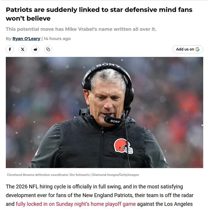 Jeffrey Armstrong+FollowPatriots Eye Browns’ Schwartz for 2026 DC?Could the Hoodie’s legacy get a new twist? Word is, Mike Vrabel might be eyeing Jim Schwartz—Cleveland’s defensive wizard—for the Patriots’ DC job in 2026. Schwartz has kept the Browns’ D elite even as the franchise faces chaos, and his history with Vrabel in Tennessee adds fuel to the fire. If this move happens, New England’s sideline could be stacked with head coach-level minds. Thoughts on this potential AFC power shift? #Sports #Football #Patriots00Share