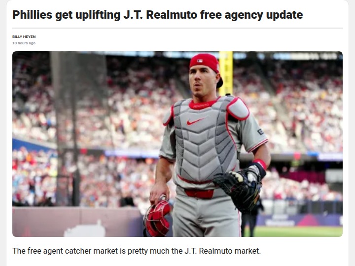Cassandra Reed+FollowIs J.T. Realmuto Philly’s Must-Keep Star?Philly fans, the J.T. Realmuto free agency saga is heating up! The “BCIB” (Best Catcher in Baseball) may be aging, but with the market so thin, it’s hard to see the Phillies letting him walk. MLB insiders are calling the Phils a “perfect fit” for Realmuto, especially after bringing back Schwarber. Losing J.T. could drop our catching depth to the basement. Do you think the front office will lock him in for an eighth season? #Sports #Baseball #Phillies10Share
