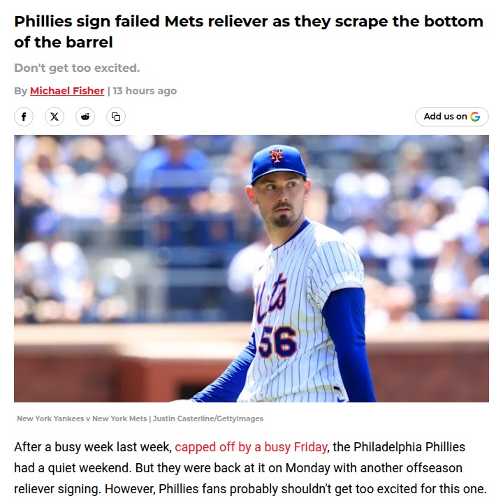 Renee Ramirez+FollowPhillies Nab Mets Castoff, Upstaging YankeesLooks like the Phillies are taking a page from the Yankees’ playbook by signing Colin Poche, a former Mets lefty who barely made a dent in Queens. After the Mets and Yankees both picked up ex-Mets with little success, Philly’s move has fans scratching their heads—especially since Poche struggled with a sky-high ERA and was recently DFA’d by the Nationals. Are the Phillies really building a contender with Mets leftovers, or just hoping for a miracle turnaround? #Sports #Baseball #Phillies10Share