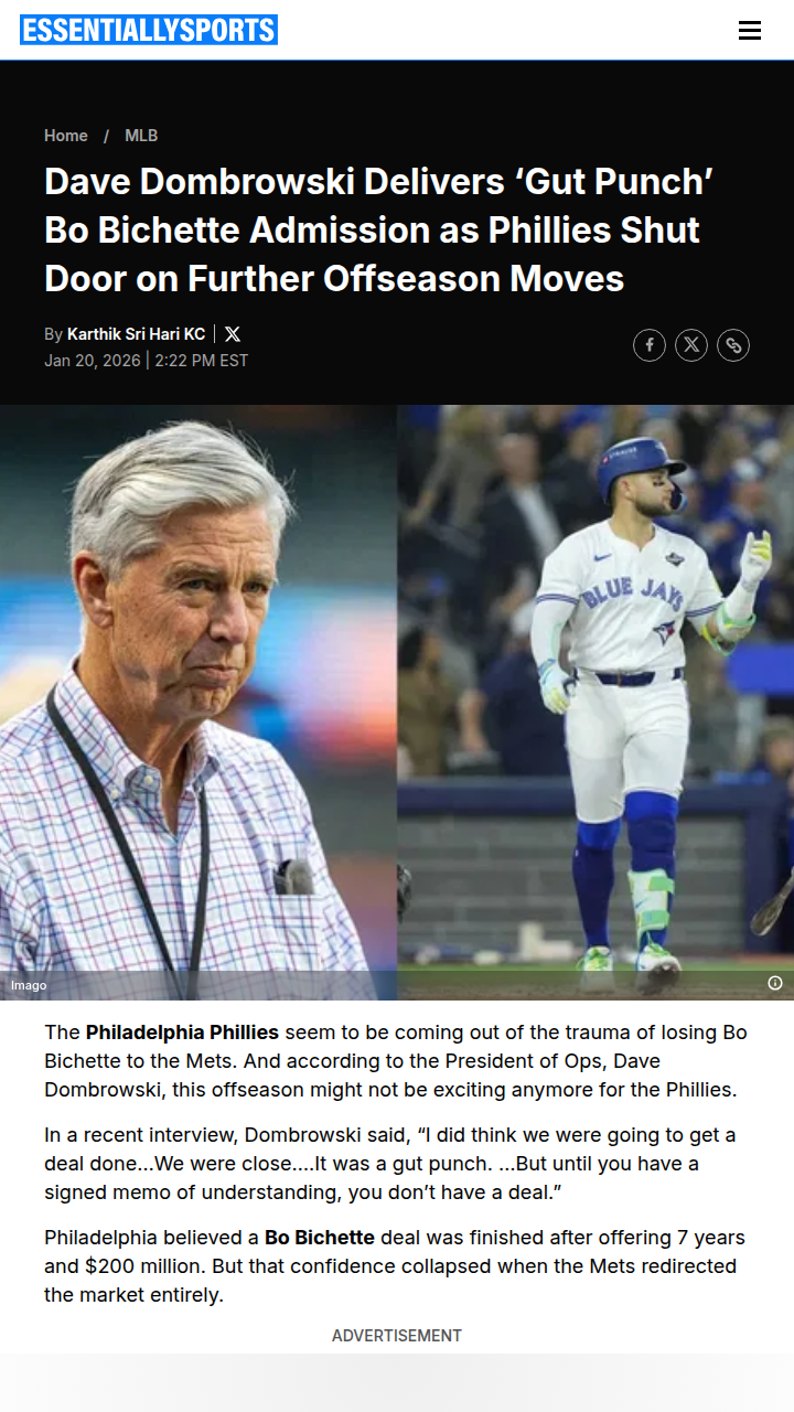 Catherine Reeves+FollowBo Bichette’s Mets move shakes up Phillies fansLosing Bo Bichette to the Mets has left Phillies fans reeling, especially after the front office admitted they thought the deal was done. The Phillies offered a massive 7-year contract, only to watch the Mets swoop in with a shorter, high-dollar deal and steal their target. Now, with Dave Dombrowski shutting down any more big offseason moves, Philly is banking on its current roster to compete—even as the Mets keep adding firepower. Do you think the Phillies’ patience will pay off, or will this quiet offseason haunt them in the division race? #Sports #Baseball #Phillies00Share