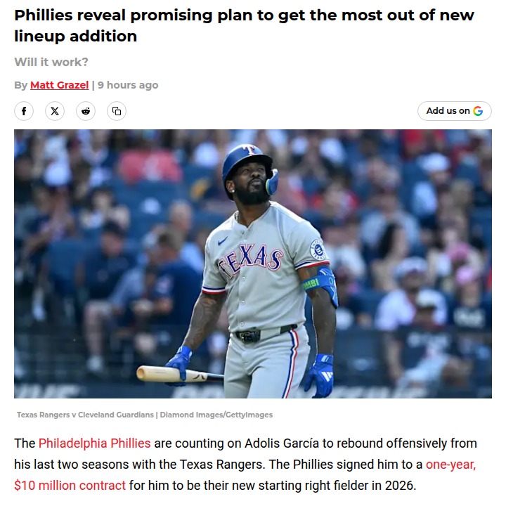 Cassandra Reed+FollowPhillies’ bold bet: Can García spark the lineup?Adolis García’s arrival in Philly is turning heads—not just for his power bat, but for what he could mean to the Phillies’ outfield. While his home run numbers dipped last season, the team is betting big that some tweaks with hitting coach Kevin Long can unlock his best. García’s defense is already a huge upgrade, but the real question is: can he cut down on chasing pitches and become the reliable cleanup hitter the Phillies need? If he finds his groove, this lineup could be a real threat. What do you think—will García bounce back and deliver in 2026? #Sports #Baseball #Phillies10Share