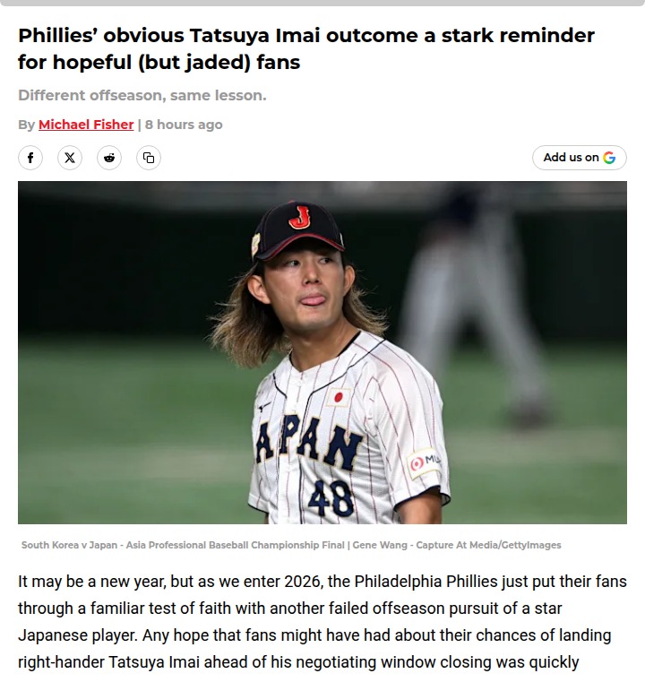 Catherine Reeves+FollowPhillies fans feel the sting as Imai picks AstrosAnother offseason, another gut punch for Phillies fans. Just as hopes were rising for Tatsuya Imai to become the team’s first big NPB signing, the Houston Astros swooped in with a three-year, $54 million deal. It’s tough not to feel déjà vu—remember the Yoshinobu Yamamoto saga? Despite talk of growing a pipeline from Japan, Philly keeps missing out on top international talent. Is it just bad luck, or does the front office need to rethink its approach? What do you think it’ll take for the Phillies to finally land a star from overseas? #Sports #Baseball #Phillies00Share