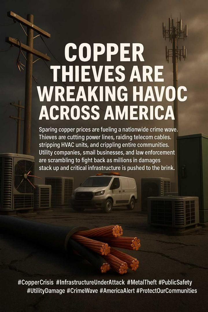 THE MORAL FORGE+FollowCopper Thieves Are Wreaking Havoc Across America Soaring copper prices are fueling a nationwide crime wave. Thieves are cutting power lines, raiding telecom cables, stripping HVAC units, and crippling entire communities. Utility companies, small businesses, and law enforcement are scrambling to fight back as millions in damages stack up and critical infrastructure is pushed to the brink. #CopperCrisis #InfrastructureUnderAttack #MetalTheft #PublicSafety #UtilityDamage #CrimeWave #AmericaAlert #ProtectOurCommunities #TheMoralForge100Share