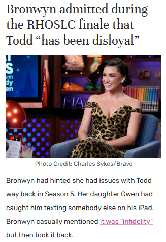 Leah Gonzales+FollowBronwyn drops truth bomb on RHOSLC finaleBronwyn Newport didn’t hold back in the RHOSLC season finale, finally confirming what fans have suspected: her husband Todd Bradley has been disloyal. After seasons of rumors, awkward iPad discoveries, and whispers among the cast, Bronwyn came clean about the loyalty issues in her marriage. Her honesty about feeling let down by people close to her—including Todd—struck a chord. Now that the couple has separated, it’s got everyone talking: what does loyalty really mean in relationships, and how do you move forward after trust is broken? Let’s hear your thoughts! #Entertainment #Celebrity #RHOSLC00Share