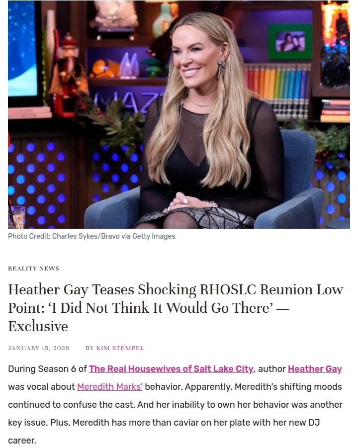 Christine Cobb+FollowRHOSLC reunion drama hits an all-time lowHeather Gay just revealed that the upcoming Real Housewives of Salt Lake City reunion is about to get messier than ever—so much so that even Andy Cohen had to walk off set! Longtime tensions between Heather and Meredith Marks explode, with old wounds from past seasons resurfacing. Heather says she never expected things to get this intense, calling her fight with Meredith the lowest point yet. With accusations flying and friendships on the line, this reunion promises to be unforgettable. Are you ready for the wildest RHOSLC reunion yet? Whose side are you on? #Entertainment #TVSeries #RHOSLC21Share