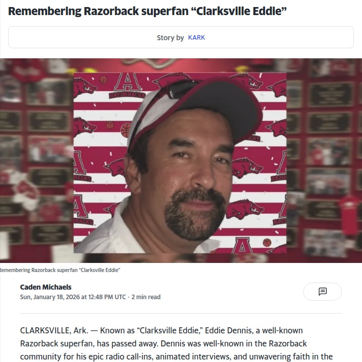 davidsonbrandon+FollowClarksville’s Razorback Eddie leaves a legacyLosing “Clarksville Eddie” Dennis feels like the end of an era for Razorback fans across Arkansas. He wasn’t just the guy with the Hogs gear and the pickup covered in magnets—he was the heart and soul of the fanbase, always bringing humor, energy, and unwavering support to every game. Friends say you could tell how the Razorbacks were doing just by watching Eddie’s mood. His kindness and infectious spirit turned strangers into friends and even converted a few non-fans along the way. Who else remembers Eddie’s legendary call-ins or run-ins at the truck gate? Let’s share our favorite Eddie stories and keep his Razorback pride alive! #Sports #ClarksvilleEddie #Razorbacks00Share