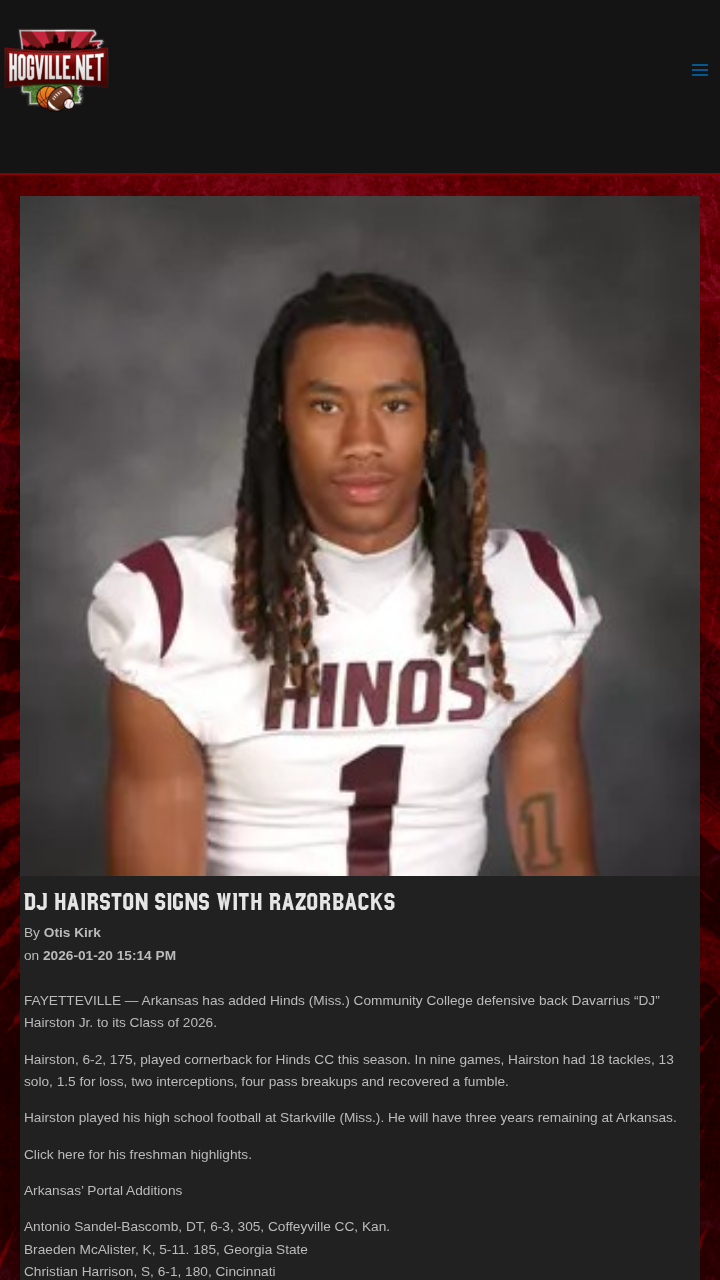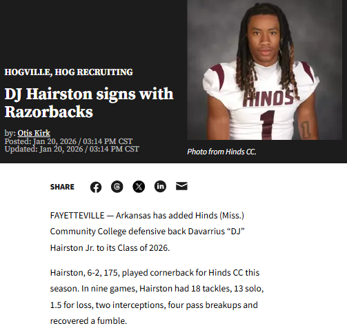 Jay Williams+FollowRazorbacks land DJ Hairston for 2026Arkansas just scored a big addition for its 2026 football class: DJ Hairston, a standout defensive back from Hinds Community College. At 6'2" and 175 pounds, Hairston made his mark this season with 18 tackles, two interceptions, and a knack for breaking up plays. He’ll bring three years of eligibility to Fayetteville, adding depth and athleticism to the Razorbacks’ secondary. With so many new faces joining the team from across the country, it’s clear Arkansas is building something special. What do you think this new wave of talent means for the Hogs’ future? #Sports #Football #Razorbacks00Share