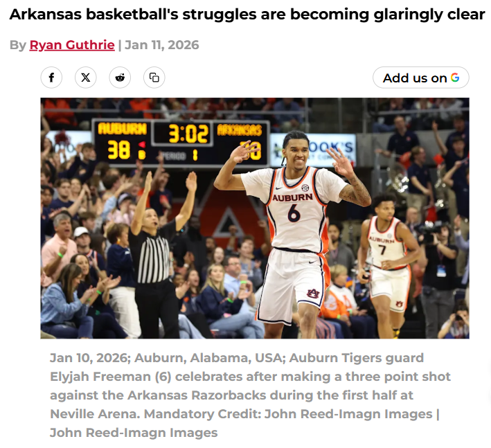 EchoingEagle+FollowRazorbacks slip in rankings, but big games aheadArkansas basketball just dropped to No. 17 in the latest USA TODAY Coaches Poll after a tough week—beating Ole Miss but falling hard to Auburn. Even with standout performances from freshmen Darius Acuff Jr. and Meleek Thomas, the Hogs couldn’t keep up with Auburn’s hot offense. The SEC is stacked this year, with Vanderbilt, Alabama, Florida, and Georgia all ranked too. Arkansas faces Georgia and Vanderbilt soon, so there’s a real chance to climb back up. How do you feel about the Hogs’ chances to bounce back? Which matchups are you most excited for? #Sports #ArkansasBasketball #Razorbacks00Share