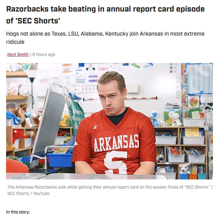 Christopher Hughes+FollowRazorbacks roasted in SEC Shorts report cardArkansas fans, the latest SEC Shorts episode doesn’t hold back—calling out the Razorbacks as possibly the best 2-10 team ever, but still handing out some tough grades. After a season most of us would rather forget, this annual comedy tradition delivers some much-needed laughs (and a few winces) as it pokes fun at not just the Hogs, but also Texas, Alabama, LSU, and even Kentucky. Whether you’re still frustrated or ready to move on, this is the perfect way to hit reset and find some humor in the pain. What’s your take—fair roasting or too harsh? #Sports #Football #Razorbacks00Share