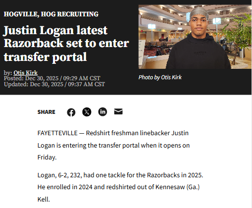 glen25+FollowRazorbacks linebacker Justin Logan hits transfer portalJustin Logan, a redshirt freshman linebacker for the Razorbacks, is entering the transfer portal this Friday. After just one tackle in 2025 and three years of eligibility left, Logan’s move could shake up Arkansas’ linebacker depth. Meanwhile, special teams get a boost as kicker Scott Starzyk and punter Gavin Rush plan to return for the 2026 season. With roster changes like these, how do you think the team’s dynamics will shift next season? Who do you see stepping up in Logan’s absence? Let’s talk about what this means for the Hogs’ future! #Sports #Football #Razorbacks00Share