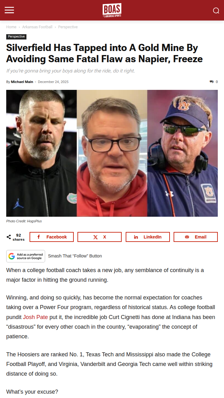 Christopher Hughes+FollowSilverfield’s Staff Moves: Smart or Risky?Razorback Nation, what do we think of Head Hog Silverfield bringing a Memphis-heavy staff to Fayetteville? Unlike Freeze and Napier, Silverfield kept his trusted OC Cramsey, mirroring Coach Cig’s instant Indiana turnaround. The trend says continuity at OC pays off, but is this Memphis import recipe enough for the SEC grind? Let’s hear your takes—will Silverfield’s gamble break the Razorback curse or fall flat? #Sports #Football #Razorbacks00Share