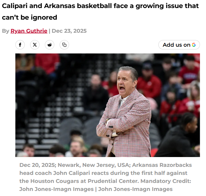 CrimsonChameleon+FollowArkansas basketball’s toughest test yetJohn Calipari didn’t mince words after Arkansas’ showdown with Houston—he felt the Razorbacks never really had a shot. Despite battling through a brutal non-conference schedule packed with top-10 teams, this was the first game where Calipari saw his squad outmatched from the start. Houston’s guard play simply took over, and Arkansas couldn’t claw back after falling behind early. Even with a 2-3 record against elite opponents, Calipari’s honesty about where the team stands is refreshing. What do you think Arkansas needs to fix before SEC play? Let’s hear your thoughts on how the Hogs can bounce back! #Sports #ArkansasBasketball #Razorbacks00Share