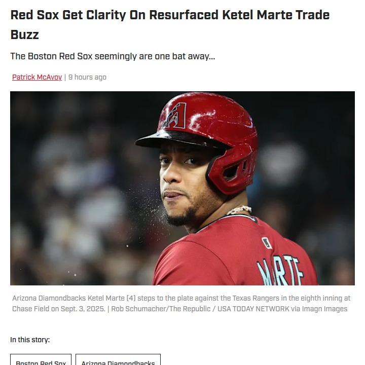 Maria Chavez+FollowRed Sox fans react to Ketel Marte trade newsBoston’s hopes for a blockbuster infield upgrade took a hit—Arizona’s GM has officially shut down all trade talks for Ketel Marte, even after the Red Sox missed out on Alex Bregman. The Sox did lock in Ranger Suárez to strengthen the rotation and added Willson Contreras, but the hunt for a power-hitting infielder continues. With Marte off the table, what’s the next move for Boston? Do you think the current roster can compete, or is another big trade a must before Opening Day? Let’s hear your takes! #Sports #Baseball #RedSox21Share