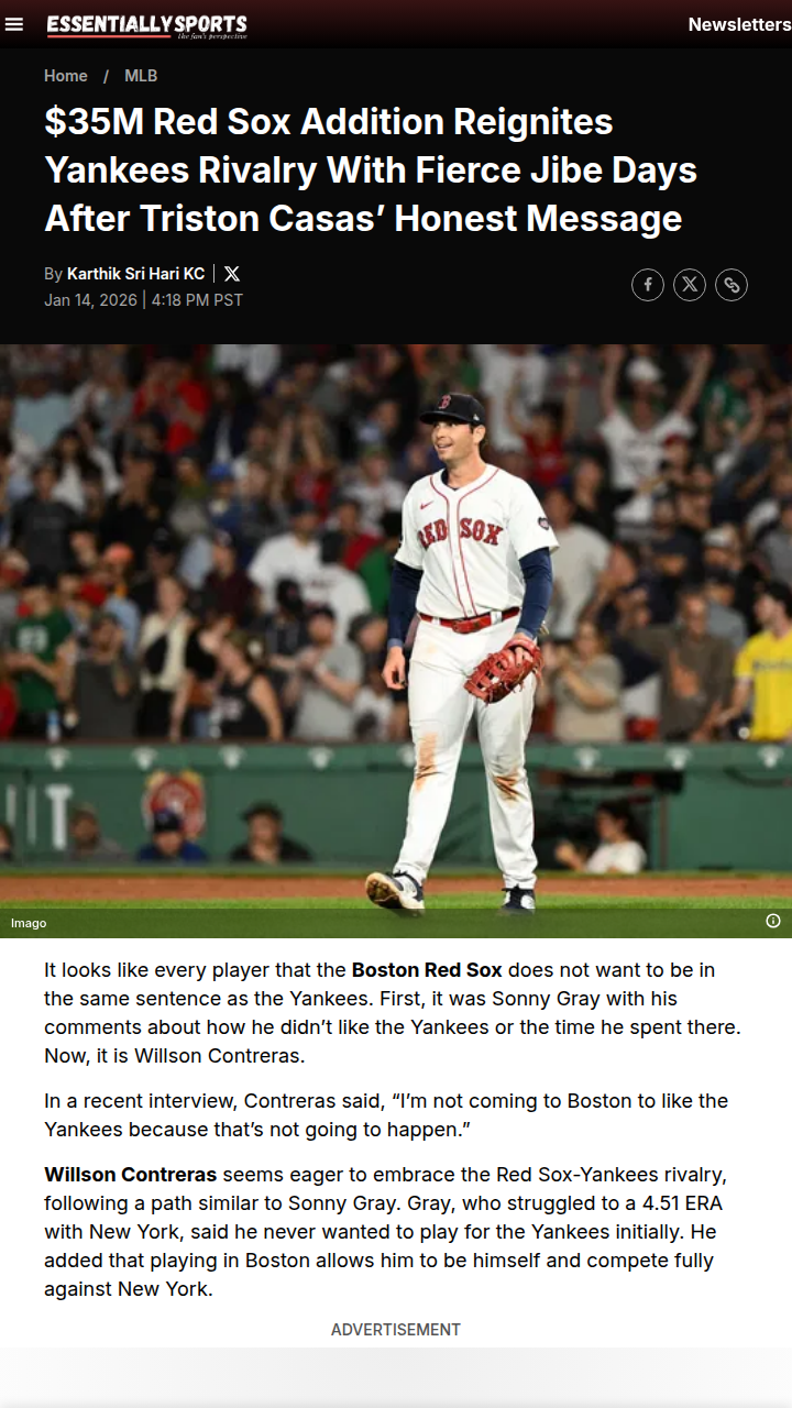 Cassandra Reed+FollowRed Sox’s $35M Power Move Rattles YankeesWillson Contreras just made it clear—he’s not in Boston to make friends with the Yankees. The new $35M Red Sox addition dropped a fiery quote, echoing Sonny Gray’s old anti-Yankee sentiment, and instantly reignited the rivalry. With Contreras’ big bat and Ranger Suarez’s arrival, Boston’s making a statement: the AL East is personal this year. Are the Yankees ready for this new-look Sox squad? #Sports #Baseball #RedSox40Share