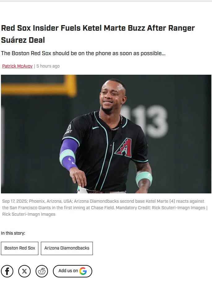 jillian59+FollowRed Sox’s bold moves could shake up the ALBoston just locked in Ranger Suárez for $130 million, instantly giving the Red Sox one of the deepest starting rotations in the league. Now, with so much pitching depth, the buzz is that Boston might finally make a play for Ketel Marte, even though Arizona says he’s off the market. Imagine adding Marte’s bat to a lineup that’s already stacked—this could turn the Sox into serious contenders. Do you think Boston should trade from their pitching surplus to go all-in for Marte, or stick with what they’ve got? #Sports #Baseball #RedSox02Share