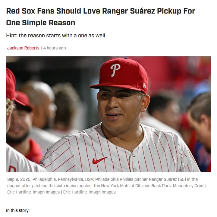 Renee Ramirez+FollowRed Sox Land Ranger Suárez in $130M PivotTalk about a power move! After missing out on Bregman, the Sox front office wasted no time and locked up Ranger Suárez for five years at $130 million. Suárez, the former Phillies ace, brings a 3.20 ERA from last season and serious big-market experience. With him joining the rotation, Boston might just have the deepest staff in the AL. Did Chaim Bloom just outmaneuver the Cubs? Let’s hear your takes, Nation! #Sports #Baseball #RedSox00Share