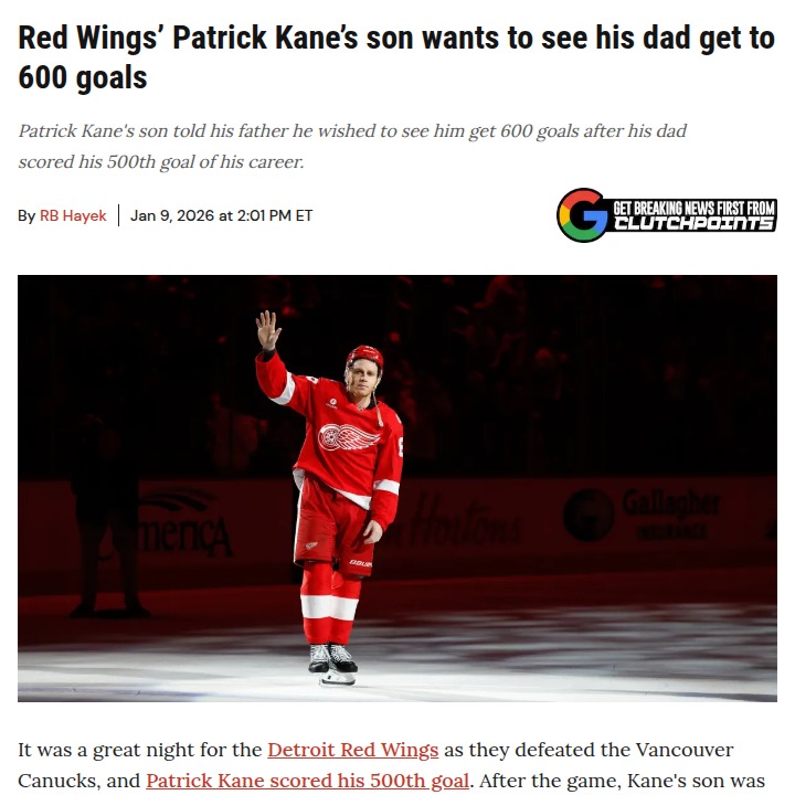 William Morrow+FollowKane Hits 500! Can He Reach 600 for the Wings?What a night for Showtime! Patrick Kane finally broke his scoring drought and notched his 500th career goal, helping the Red Wings dominate the Canucks 5-1. The best part? Kane’s son stole the show postgame, telling his dad not to retire until he hits 600 goals (or turns 75!). With the Wings now tied for first in the Atlantic, do you think Kane can keep the magic going against the Habs next? #Sports #IceHockey #RedWings20Share