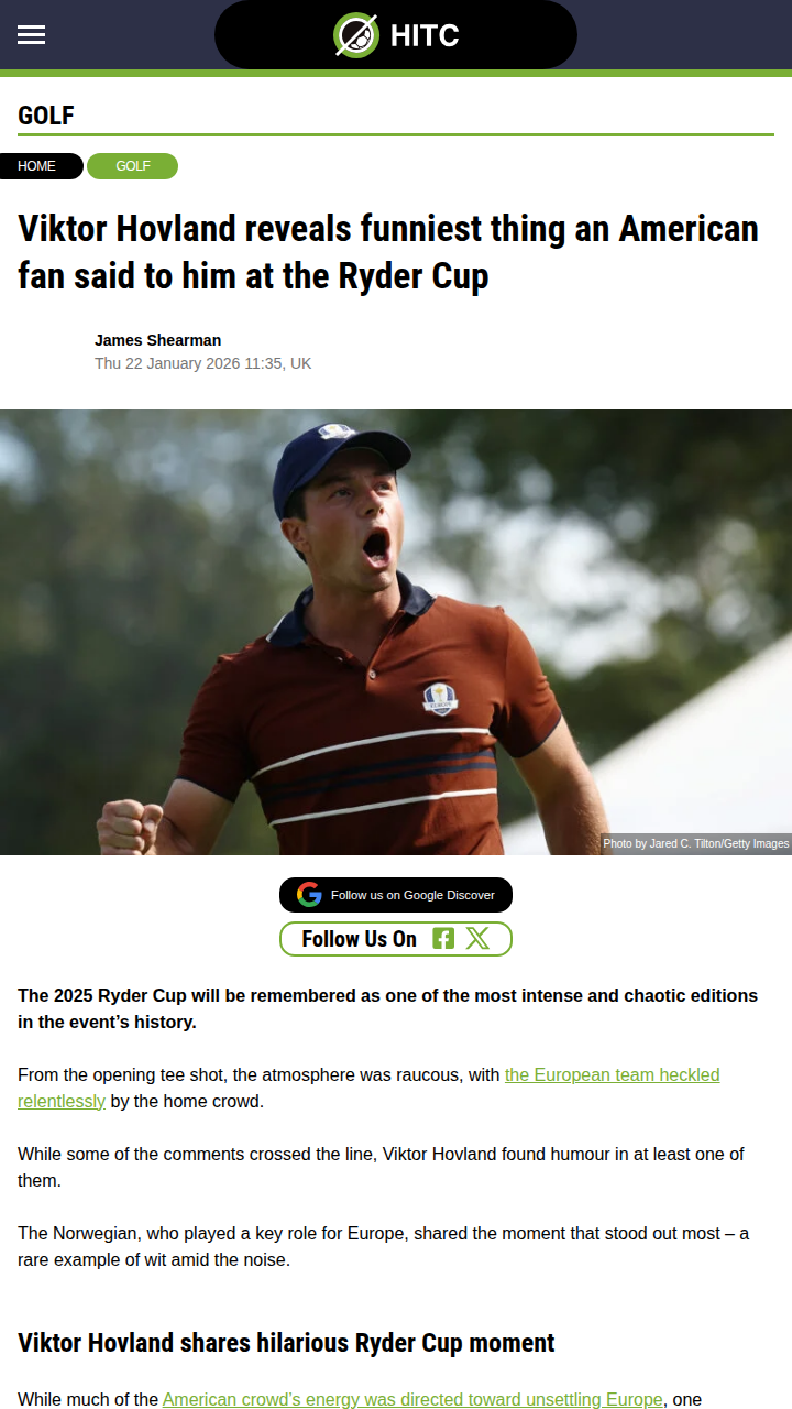 rmendoza+FollowHovland’s Ryder Cup Heckle: Best Fan Burn?The 2025 Ryder Cup was pure chaos, but leave it to the Iceman, Viktor Hovland, to find the funny in the madness. While Team Europe got heckled all weekend, Hovland shared the wildest chirp he heard: “Three Ryder Cups and no girlfriend. Kinda weird.” Instead of getting rattled, Viktor just laughed it off—classic cool under pressure. That’s why he’s become a fan favorite, even when the crowd’s at its rowdiest. #Sports #Golf #RyderCup10Share
