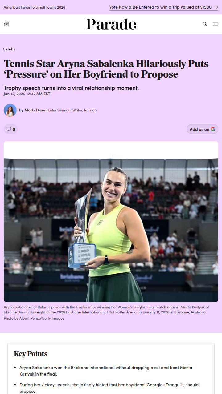 Brittany Gilbert+FollowSabalenka Steals the Show in BrisbaneHow about Aryna “The Tiger” Sabalenka at Brisbane? Not only did she dominate Kostyuk in straight sets for her third title there, but her post-match mic drop was pure gold. Sabalenka playfully called out her boyfriend in front of the crowd, hinting at a proposal and getting everyone laughing. It’s moments like these that show why she’s a fan favorite heading into the Australian Open. Anyone else think we’ll see a ring before another trophy? #Sports #Tennis #Sabalenka10Share