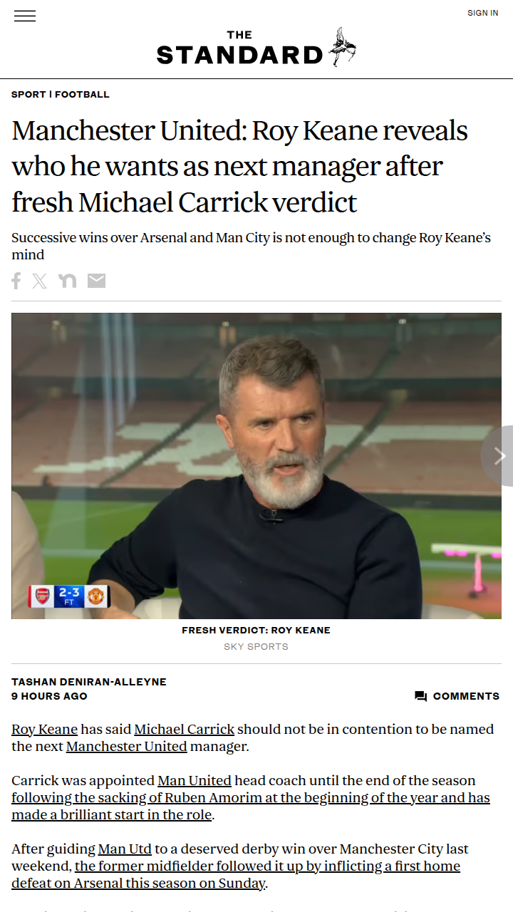 Malik Williams+FollowKeane Doubts Carrick After Arsenal WinEven after back-to-back wins over City and the Gunners, Roy Keane isn’t buying into Michael Carrick as the next United boss. The Captain says those results aren’t enough—he wants a proven winner at Old Trafford if the Reds are going to chase league titles again. Do you agree with Keano, or has Carrick earned a shot? Let’s hear your takes! #Sports #Soccer #ManUtd00Share