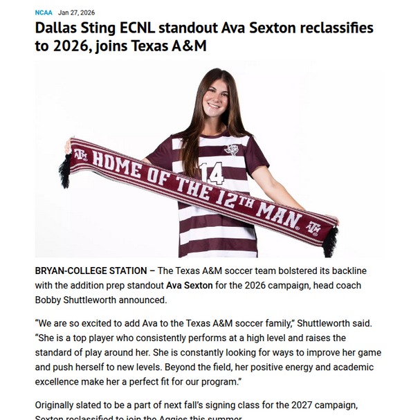 Jamie Mack+FollowAva Sexton fast-tracks to AggielandAva Sexton is shaking up Texas A&M soccer by reclassifying and joining the Aggies a year early for the 2026 season. Known for her leadership and relentless drive, Ava’s already made waves as captain of the Dallas Sting ECNL squad and earned national recognition. She’s not just a force on the field—her academic achievements stand out, too. With her early arrival, the Aggies’ defense just got a major boost. What do you think about high school athletes accelerating their college careers? Is this the new normal for top talent? #Sports #Soccer #TexasAM00Share