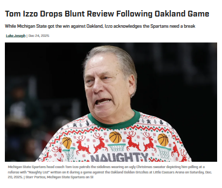 EchoingEagle+FollowSpartans outlast Oakland in Detroit thrillerCoen Carr’s breakout 22-point performance helped Michigan State secure a hard-fought 79-70 win over Oakland in Detroit, keeping the Spartans’ season rolling at 11-1. The holiday spirit was alive with both coaches donning Christmas sweaters, but it was the gritty play on the court that stood out—especially as Oakland’s zone defense kept things tense. Jaxon Kohler’s seventh double-double and clutch shooting from Kur Teng and Jordan Scott made the difference. Fans, what do you think this win says about the Spartans’ readiness for conference play? Let’s hear your thoughts on their late-game composure! #Sports #MichiganState #Spartans00Share