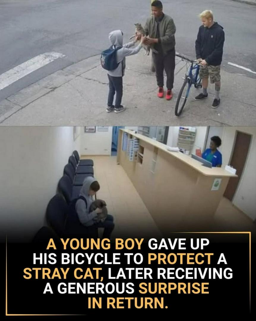 Tiffani chavez+FollowYoung Boy’s Selfless Act to Save a Stray Cat Sparks Viral Wave of Kindness On his way to school, a young boy witnessed something that stopped him in his tracks: a stray cat being harassed by other children. Rather than ignoring the situation or walking away, he chose compassion. Calm and determined, the boy stepped in and made an unexpected offer—his bicycle—in exchange for the cat being left alone. Once the danger had passed, he gently carried the frightened animal to a nearby veterinary clinic to make sure it was safe and unharmed. The story of his brave and selfless act quickly spread across social media, capturing the hearts of thousands. Moved by his kindness, anonymous donors came together to surprise the boy with a brand-new bicycle, proving that generosity often finds its way back to those who give without expecting anything in return. The rescued cat later became a beloved part of the family. Reflecting on the experience, the boy’s father emphasized the importance of teaching children empathy, courage, and kindness toward all living beings. This simple moment serves as a powerful reminder that even small acts of compassion can inspire extraordinary generosity and create a lasting impact far beyond what we imagine #InspiringStories #StrayCatRescue #StrayKitten #StrayCatStories #Parenting #Kindness #GoodNews #FeelGoodNews #FeelGoodContent #ViralPost #ViralStory112480Share