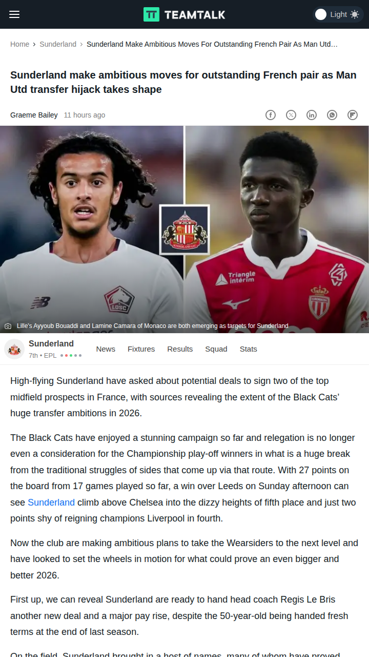 watkinsross+FollowBlack Cats Eye French Midfield GemsSunderland fans, how about this for ambition? The Black Cats are reportedly targeting two of France’s hottest young midfielders—Ayyoub Bouaddi and Lamine Camara—for a 2026 Premier League push. With the team flying high and a chance to leapfrog Chelsea after the Leeds clash, it’s clear the club’s not just settling for survival. Could these signings help us break into the top four and rival the big boys? Let’s hear your thoughts on this bold move! #Sports #Soccer #SunderlandAFC00Share