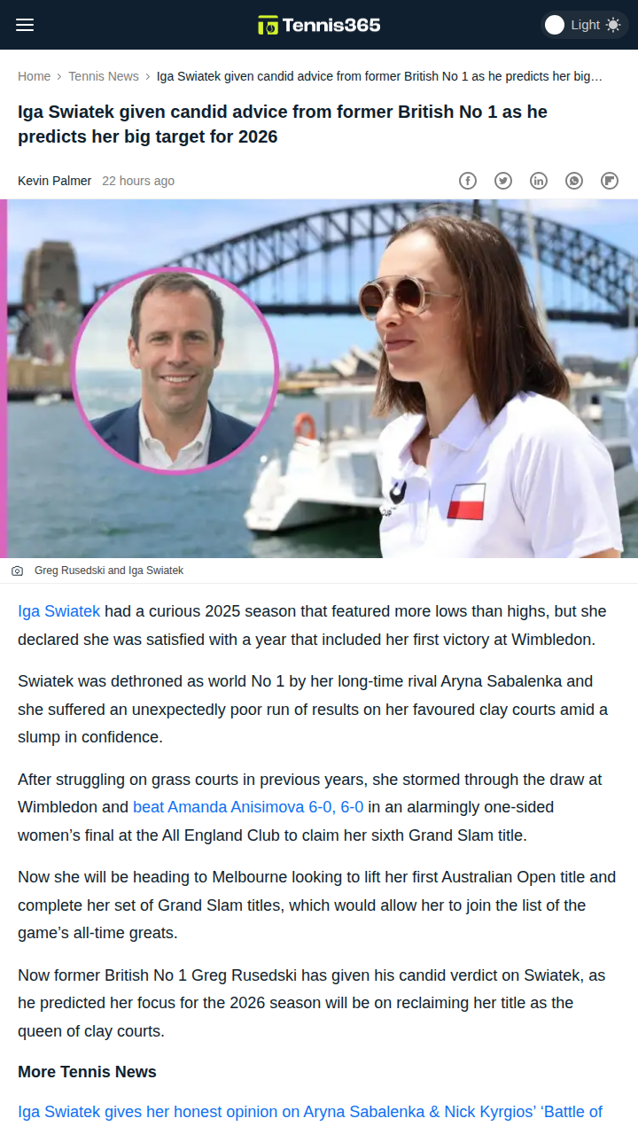 Reginald Gonzalez+FollowSwiatek Eyes Clay Comeback After Sabalenka BlowAfter a rollercoaster 2025, Iga “Queen of Clay” Swiatek finally conquered Wimbledon, but her reign at Roland Garros was ended by her fierce rival Sabalenka. Former British No 1 Greg Rusedski says Swiatek’s big 2026 target is reclaiming her clay dominance and chasing Rafa-like records. Rusedski also dropped some technical tips for Iga’s serve and forehand—do you think these tweaks will help her bounce back? #Sports #Tennis #Swiatek00Share