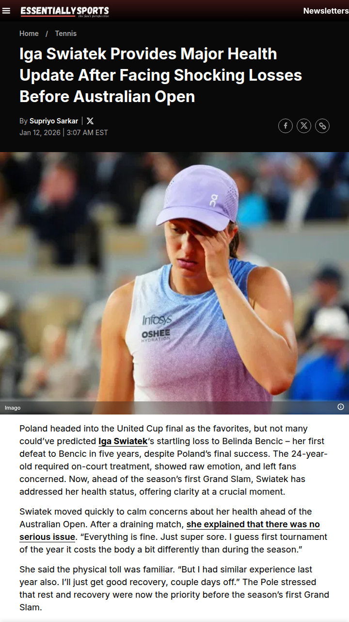Gregory Costa+FollowSwiatek’s Health Update After United Cup DramaTough weekend for Iga “The Queen of Clay” Swiatek, who suffered a rare loss to Bencic and had fans worried after needing treatment on court. Good news: Iga says it’s just early-season soreness, nothing serious, and she’s focused on recovery before the Australian Open. Team Poland still clinched the United Cup, thanks to Kawa and Zielinski’s clutch mixed doubles win. Can Swiatek bounce back in Melbourne? Let’s discuss! #Sports #Tennis #Swiatek20Share