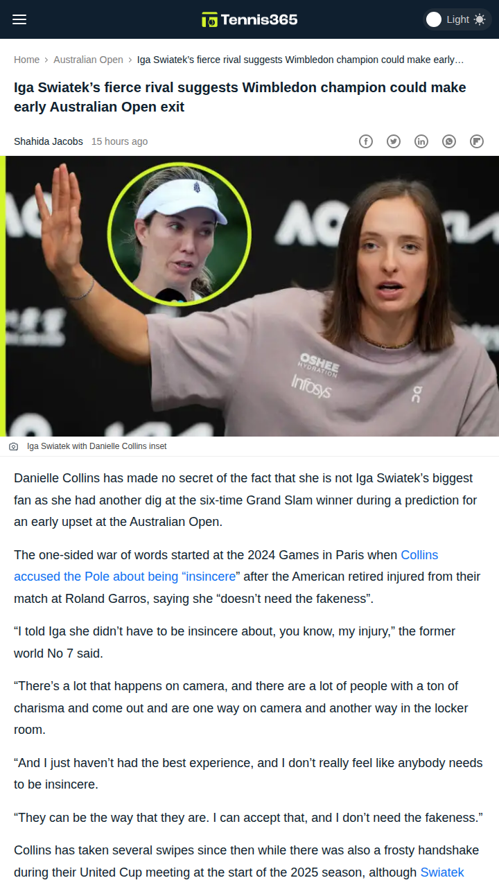 Danielle Strickland+FollowSwiatek Faces Early AO Test After Collins JabDanielle Collins isn’t holding back in her rivalry with Iga Swiatek, calling out the world No. 1’s recent form and suggesting the Wimbledon champ could make an early exit at the Australian Open. After a frosty handshake at United Cup and some pointed words about Swiatek’s sincerity, Collins doubled down on Tennis Channel, highlighting Swiatek’s back-to-back losses as a red flag. Will Swiatek silence the doubters or is an upset brewing Down Under? #Sports #Tennis #Swiatek00Share