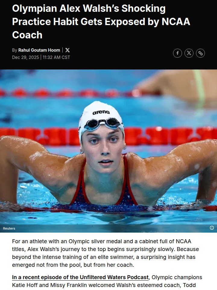 Aaron Gentry+FollowAlex Walsh’s ‘Sloth’ Routine: Secret to Success?Did anyone catch Coach DeSorbo on the Unfiltered Waters Podcast spilling the tea on Alex Walsh’s pre-practice routine? Turns out the Olympic silver medalist, aka ‘the sloth,’ is famous for her super slow walk to the pool. But don’t let that fool you—once she hits the water, she’s all business. It’s wild how her laid-back vibe off the blocks turns into pure focus when it counts. Maybe that’s the secret sauce behind UVA’s dynasty! Thoughts? #Sports #AlexWalsh #Swimming00Share