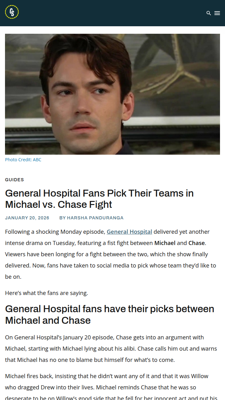 Eric Mueller+FollowMichael vs. Chase: GH Fans Take Sides 👊General Hospital fans are in full debate mode after the explosive Michael vs. Chase fist fight! Social media is buzzing with Team Michael and Team Chase posts, and it looks like Michael is winning the popularity contest. Some fans blame the writers for Chase’s character shift, while others think Willow is the real villain. Is Chase being set up for heartbreak, or will Michael finally get his redemption? The fandom is divided! #Entertainment #TVSeries #GeneralHospital91Share
