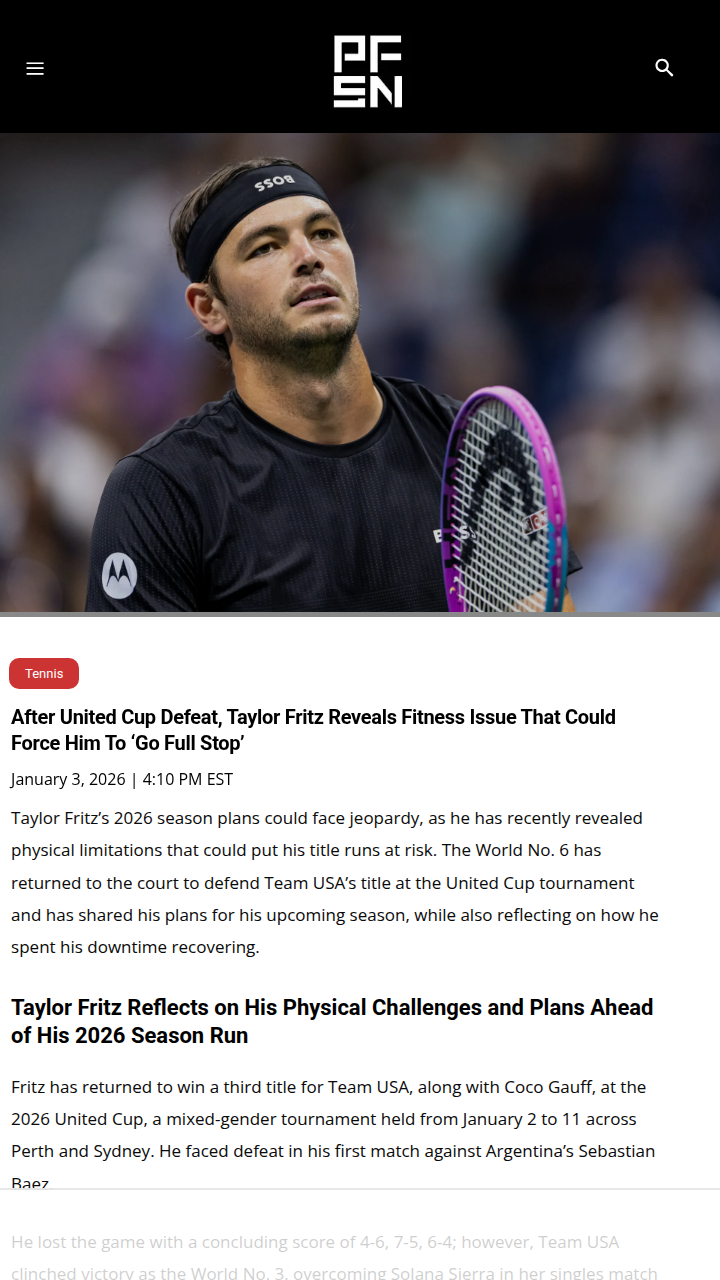 Kelly Jones+FollowFritz’s Knee Woes: Can Team USA Defend?Tough start for Taylor Fritz at the United Cup—after falling to Baez, the World No. 6 admitted his knee tendinopathy is a real concern. Fritz says he spent the entire off-season rehabbing, but if things don’t improve soon, he might have to hit pause on his 2026 season. With Fritz chasing a third United Cup title alongside Coco Gauff, fans are left wondering: can the Stars and Stripes rally if their ace goes down? #Sports #Tennis #TaylorFritz00Share
