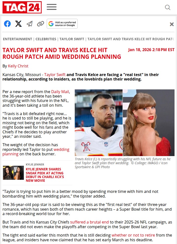 Leah Gonzales+FollowTaylor & Travis: Is NFL Drama Delaying the Wedding? 💍Rumors are swirling that Taylor Swift is pressing pause on wedding plans with Travis Kelce as he faces a tough career crossroads after the Chiefs’ rough season. Some fans think Taylor’s putting her own dreams on hold to support Travis through his possible NFL retirement. Others wonder if this is the first real test for their relationship. Are they strong enough to get through it, or is this the beginning of the end? #Entertainment #Celebrity #TaylorSwift31Share
