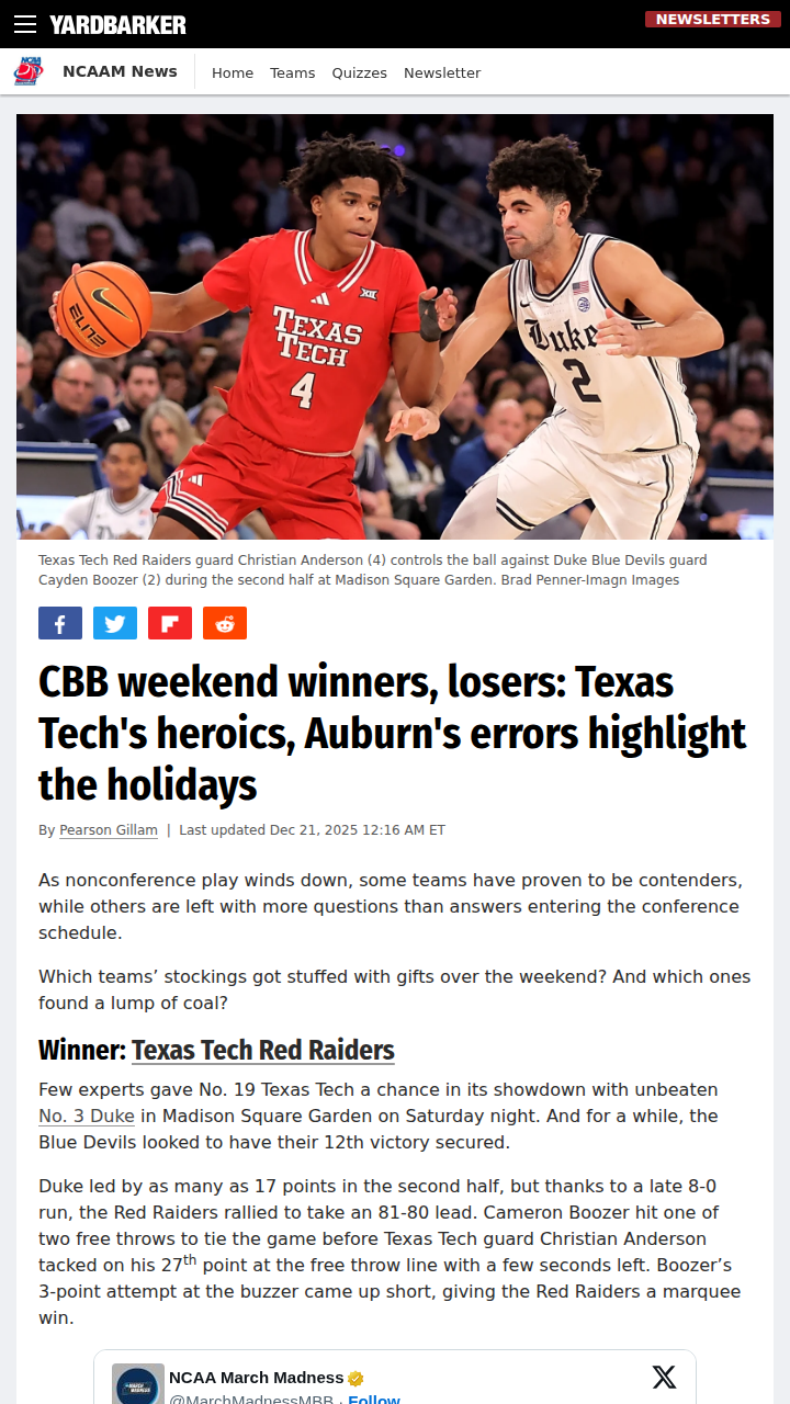 Ryan Lopez+FollowRed Raiders Stun Duke at MSGWow, what a comeback by the Red Raiders! Down 17 to the Blue Devils in the second half, Texas Tech’s Christian Anderson went off for 27 points, including the clutch free throws that sealed the 81-80 win. Duke’s Cameron Boozer had a shot to tie, but his buzzer-beater fell short. This is the kind of statement win that could define Tech’s season. Thoughts on how this shakes up the rankings? #Sports #Basketball #TexasTech00Share