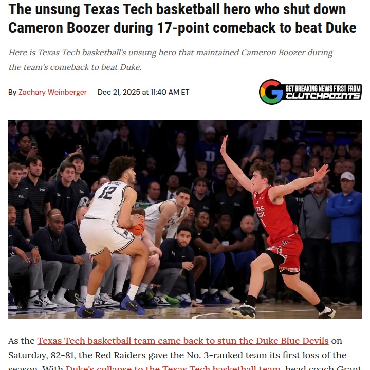 AmberAbyss+FollowRed Raiders Shock Duke at MSG!What a comeback! The Red Raiders, missing key guys and down to just six rotation players, erased a 17-point hole to stun the Blue Devils at Madison Square Garden. Christian Anderson was ice-cold, dropping 27 and hitting the clutch free throw to seal it. Duke’s unbeaten run is over, and Texas Tech just sent a message before Big 12 play. Did anyone see this upset coming? Let’s talk about how this shakes up the AP Top 25! #Sports #TexasTech #Duke00Share