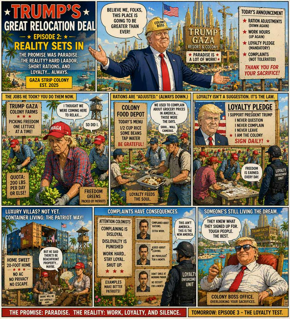 Tired of being tired+FollowWELCOME TO THE COLONY Where opportunity was promised... and control became reality. Loyalty is rewarded. Questions are noticed. Leaving... isn't simple as it sounds. Episodes 1-4 👀 Pay attention to the man in the background. #TheColony #Satire #DarkHumor #ComicSeries33Share
