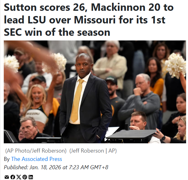 EchoingEagle+FollowLSU finally breaks through in SEC playLSU fans, that four-game skid is over! Marquel Sutton and Max Mackinnon put on a show, dropping 26 and 20 points to push the Tigers past Missouri for their first SEC win of the season. The energy in the PMAC was electric as LSU held off a late Missouri surge, thanks to clutch threes and tough defense. The Tigers’ 16 offensive rebounds made a huge difference, especially after that heartbreaking loss to Kentucky. Does this win signal a turning point for LSU’s season? What do you think made the biggest difference tonight? #Sports #LSU #Tigers00Share