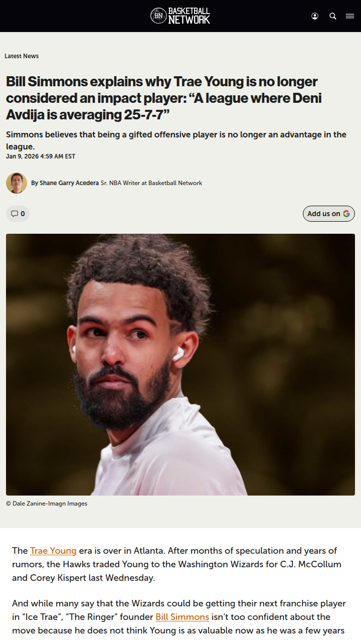 Brian Gaines+FollowIs the Ice Trae Era Really Over in Atlanta?Bill Simmons just threw some serious shade at Ice Trae, saying the Hawks’ 2021 ECF run was more luck than legacy and that Trae’s value is slipping in today’s high-powered NBA. With Young now in D.C., Simmons even compared him to Deni Avdija’s breakout stats. But is Simmons underrating Trae’s playoff pedigree? Can he prove the doubters wrong with the Wizards? Let’s hear your takes! #Sports #Basketball #TraeYoung00Share