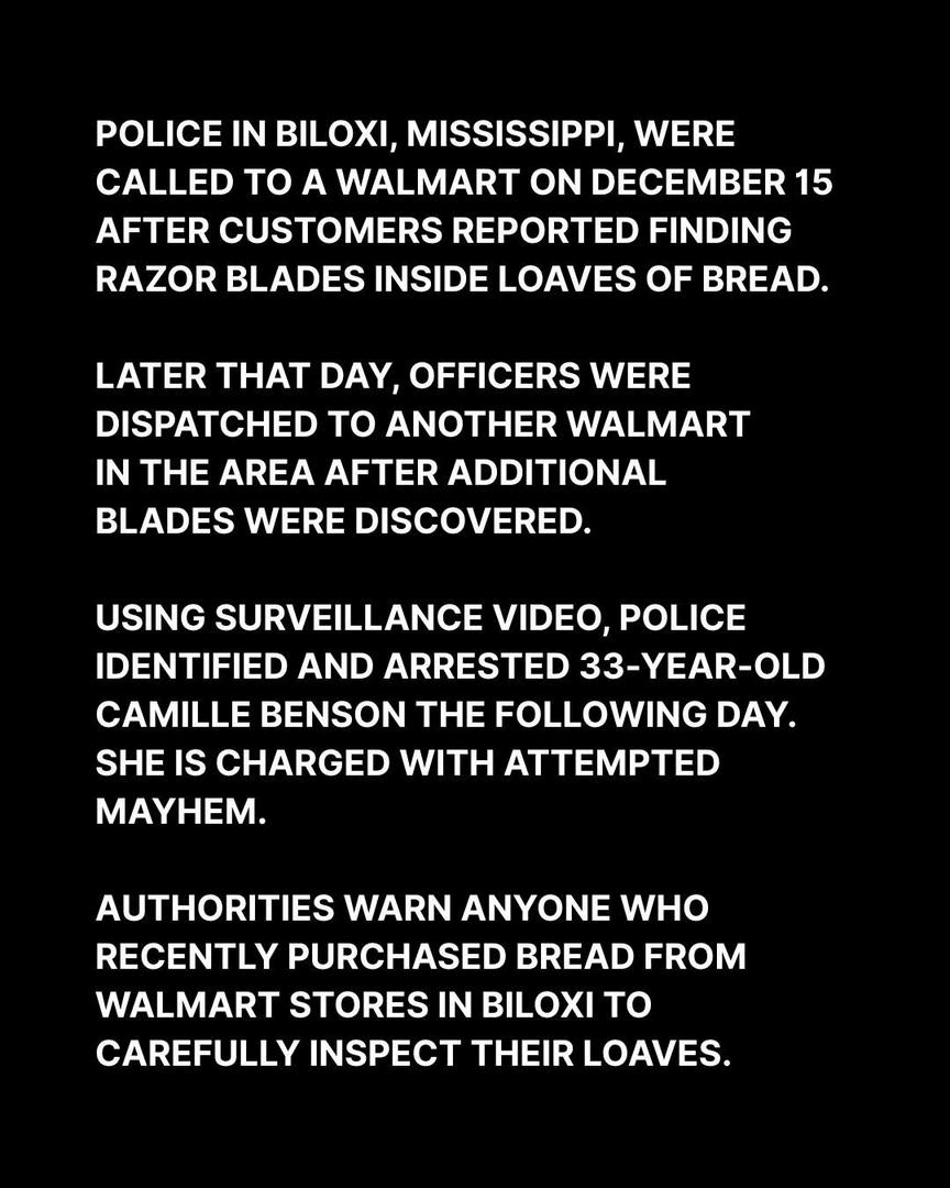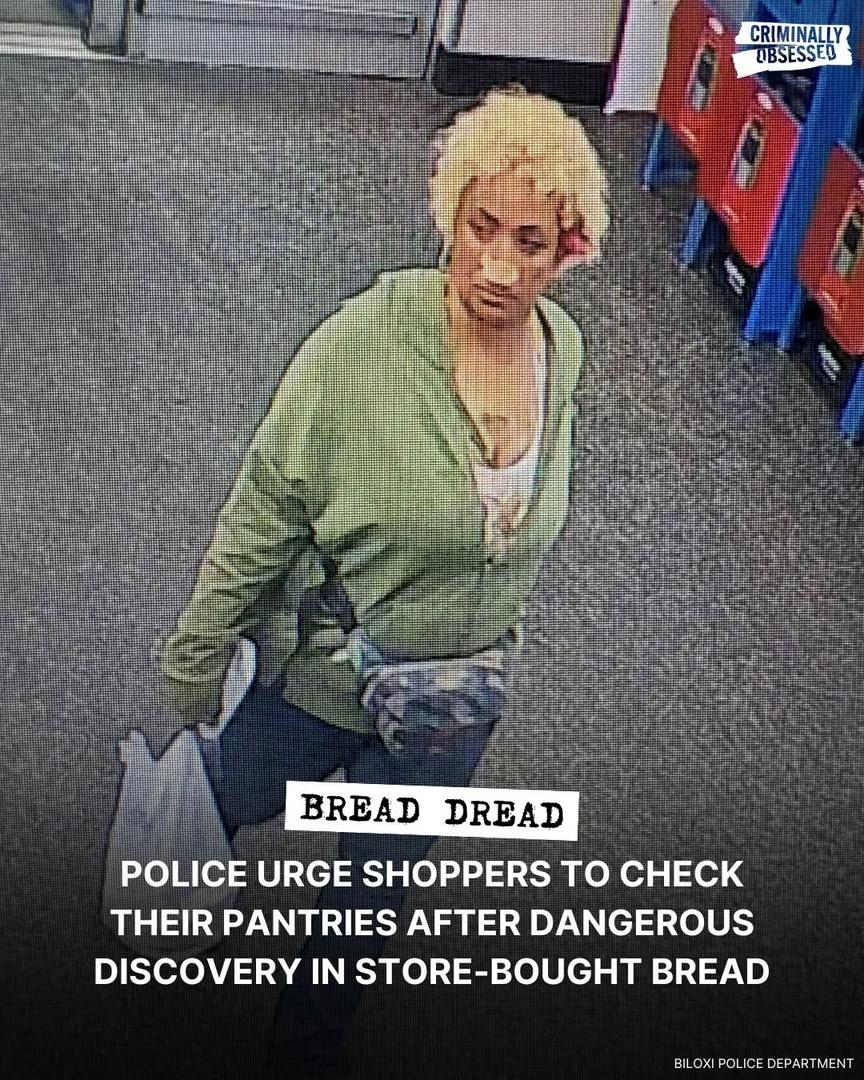 Kristy Tallman+Follow🚨 RAZOR BLADES FOUND IN BREAD AT MISSISSIPPI WALMARTS Police in Biloxi, Mississippi are warning shoppers to inspect packaged bread after razor blades were discovered inside loaves at multiple Walmart stores. Authorities say a 33-year-old woman has been arrested in connection with the incidents. No serious injuries reported, but police urge the public to stay alert and report anything suspicious. 🛒 Check packaging ⚠️ Do not consume if tampered 🚓 Investigation ongoing #TrueCrime #CrazyCrimes #Mississippi #ConsumerAlert #BreakingNews6459Share