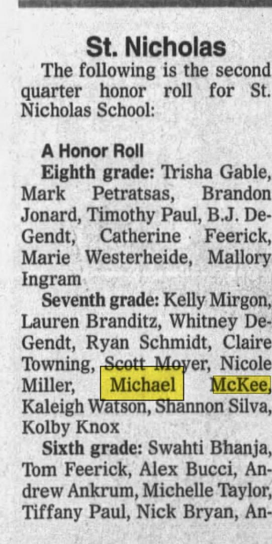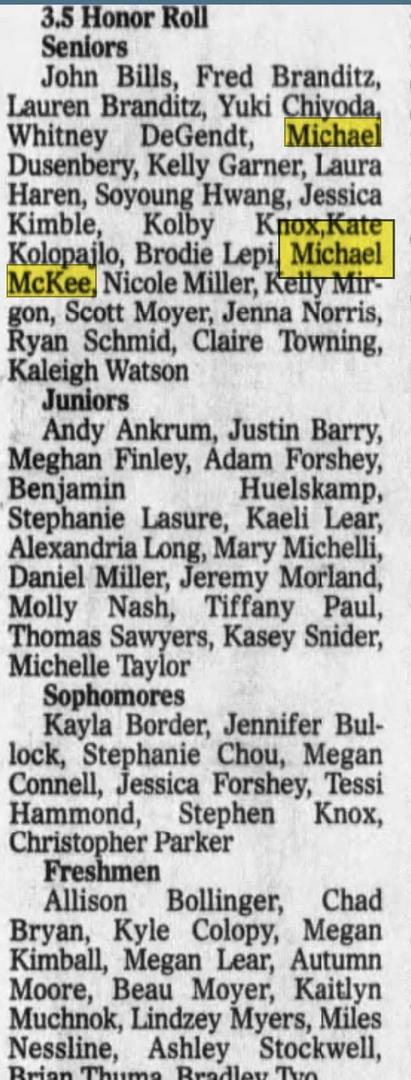 **The Michael McKee Case: Power, Possession, and Murder** This clipping comes from a local honor roll listing—the kind of page most people skim past without a second thought. Names, grades, semesters. A routine snapshot of academic achievement. Among those names: Michael McKee. At the time, this simply meant he met the standard. He did the work. He earned his place on the list alongside classmates. Nothing more, nothing less. And that’s exactly why these records matter now. Not because honor roll status explains anything. It doesn’t. Not because academic success predicts violence. It doesn’t. But because when you’re examining a case like this, these pieces show us who someone was publicly long before they were ever accused of something unthinkable. The same name that once appeared in the paper for grades and school recognition is now tied to the murders of Monique and Spencer Tepe. The contrast is stark—and sobering. These clippings don’t answer the “why.” They don’t explain the “how.” What they do remind us is that people don’t arrive at headlines overnight. They have histories. Ordinary ones. Unremarkable ones. Ones that look just like everyone else’s—until they don’t. Sometimes the hardest part of covering a case isn’t the crime itself. It’s realizing how normal the beginning looked He is innocent until proven guilty in a court of law #MichaelMcKeeCase #TheParentsSeries #TepeMurders #TrueCrimeDeepDive #BehindTheHeadlines #FamilyDynamics #AdoptionStory #SecretsAndSilence #IdentityAndTruth #EstrangedFamilies #TrueCrimeResearch #ContextMatters #UnseenHistory #DiggingDeeper #VictimCentered #JusticeFocused #DeathLiesAndAlibis #TrueCrimeCommunity