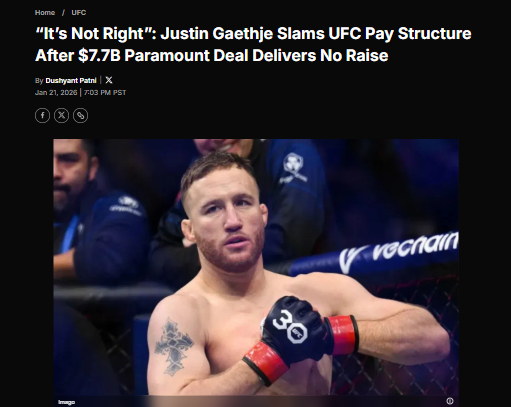 Kayla Mcconnell+FollowGaethje Calls Out UFC Pay After Paramount Deal‘The Highlight’ Justin Gaethje isn’t holding back ahead of UFC 324. Despite the UFC’s massive $7.7B media rights deal with Paramount+, Gaethje says his paycheck hasn’t budged. He’s racked up 14 bonuses, but still hasn’t cracked a million. With retirement in sight by 2027, Gaethje’s frustration is a reality check for fans: if a main-event brawler like him isn’t seeing the new money, who is? Is the UFC pay structure overdue for a shakeup? #Sports #Wrestling #UFC32410Share