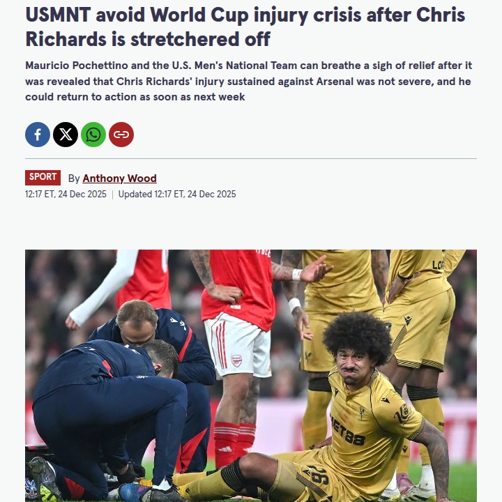 Allison Travis+FollowUSMNT’s Ironman Richards Dodges DisasterBig sigh of relief for USMNT and Palace fans—Chris Richards, the defensive anchor known for his aerial prowess, was stretchered off after a clash with Gabriel in the EFL Cup, sparking World Cup injury fears. Turns out, it’s just a stitched-up foot, not a season-ender. With Palace’s backline already battered, keeping Richards healthy is huge as the World Cup on home soil looms. Thoughts on how this impacts Palace’s defense and the USMNT’s summer hopes? #Sports #Soccer #USMNT00Share