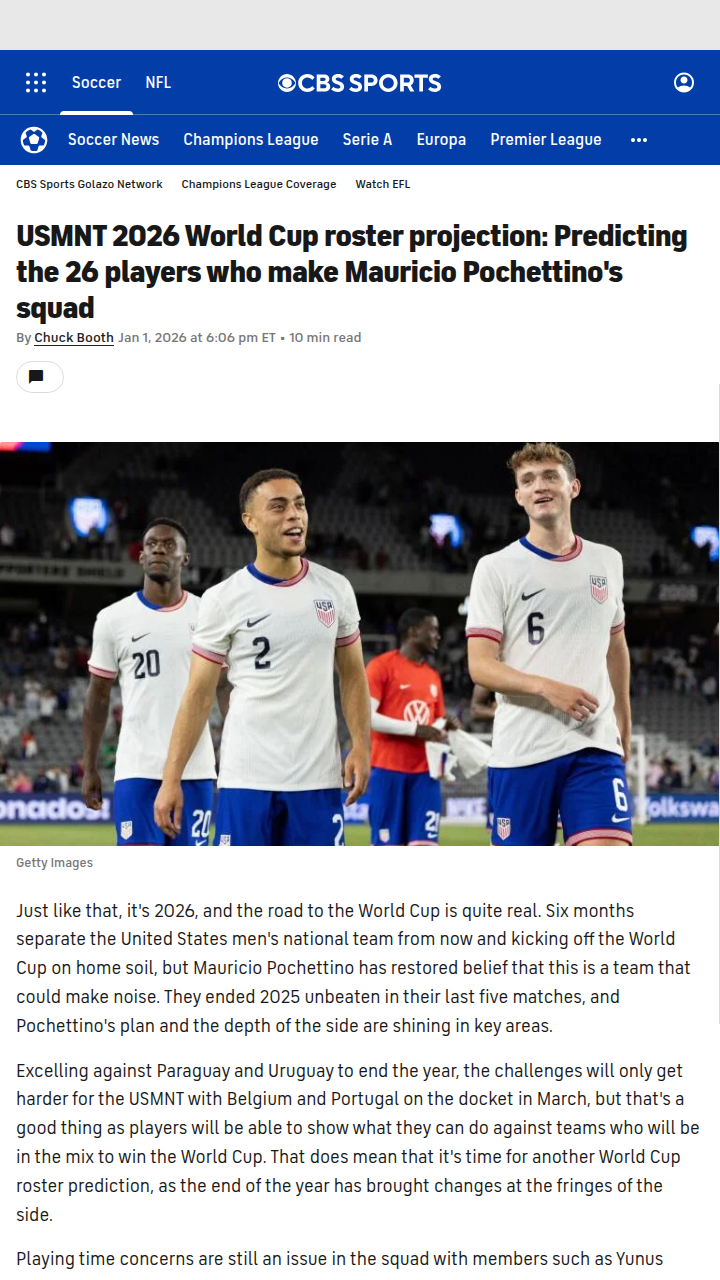 Allison Travis+FollowUSMNT Roster Shakeup: Reyna or McKennie Out?Six months out from the 2026 World Cup, the USMNT’s projected roster under Poch is sparking debate. With Captain America (Pulisic) and Jedi (Robinson) locked in, the big question is: will Gio Reyna’s clutch goals or McKennie’s return to form matter more? Tyler Adams’ injury looms large, and with Belgium and Portugal up next, bubble players like Pepi and Luna have a shot to impress. Who’s your surprise pick for the final 26? #Sports #Soccer #USMNT00Share