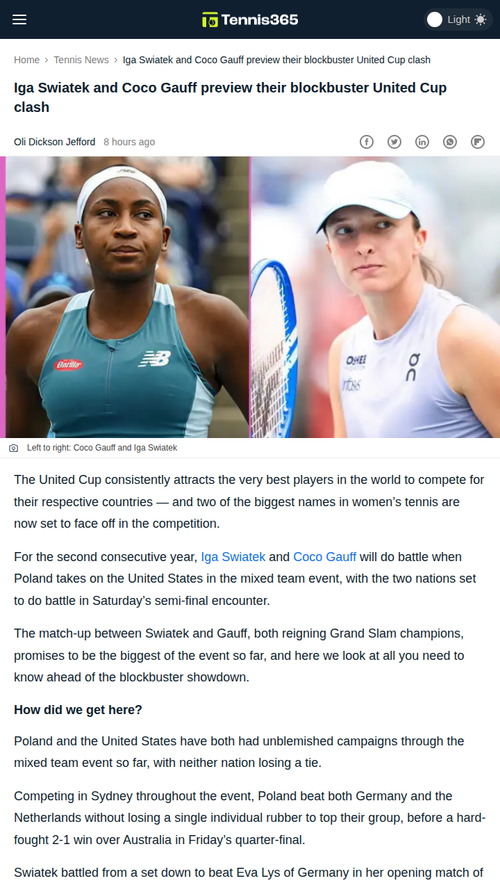 Nicholas Henderson+FollowSwiatek vs Gauff: United Cup Rivalry Heats UpAll eyes are on Sydney as Iga “The Silent Storm” Swiatek and Coco “Young Gun” Gauff gear up for another epic United Cup semi-final showdown. Both Poland and Team USA have been flawless so far, but this match is all about their growing rivalry. Swiatek dominated early, but Gauff’s won the last three, including a blowout in Madrid. Who takes the edge this time? #Sports #Tennis #UnitedCup00Share